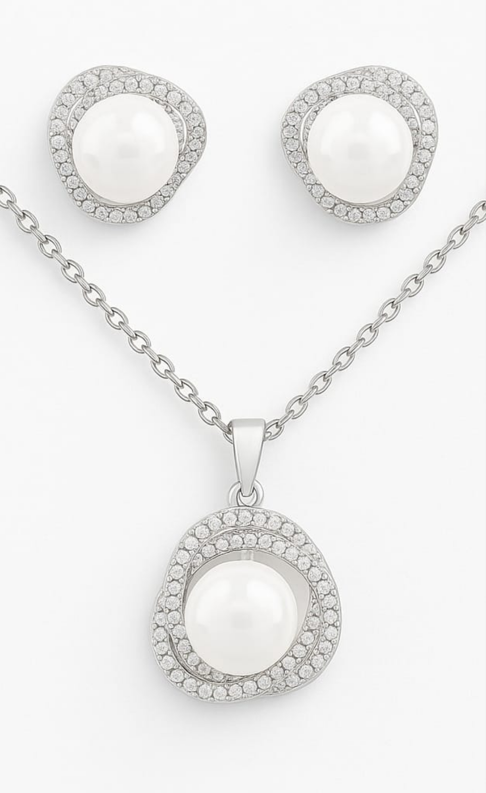 The Europa Set blends bold framing with soft shimmer. A necklace and earring pair featuring double-looped gold-plated frames that cradle high-glow faux pearls — finished with crystal-like accents. Made to elevate without overpowering.