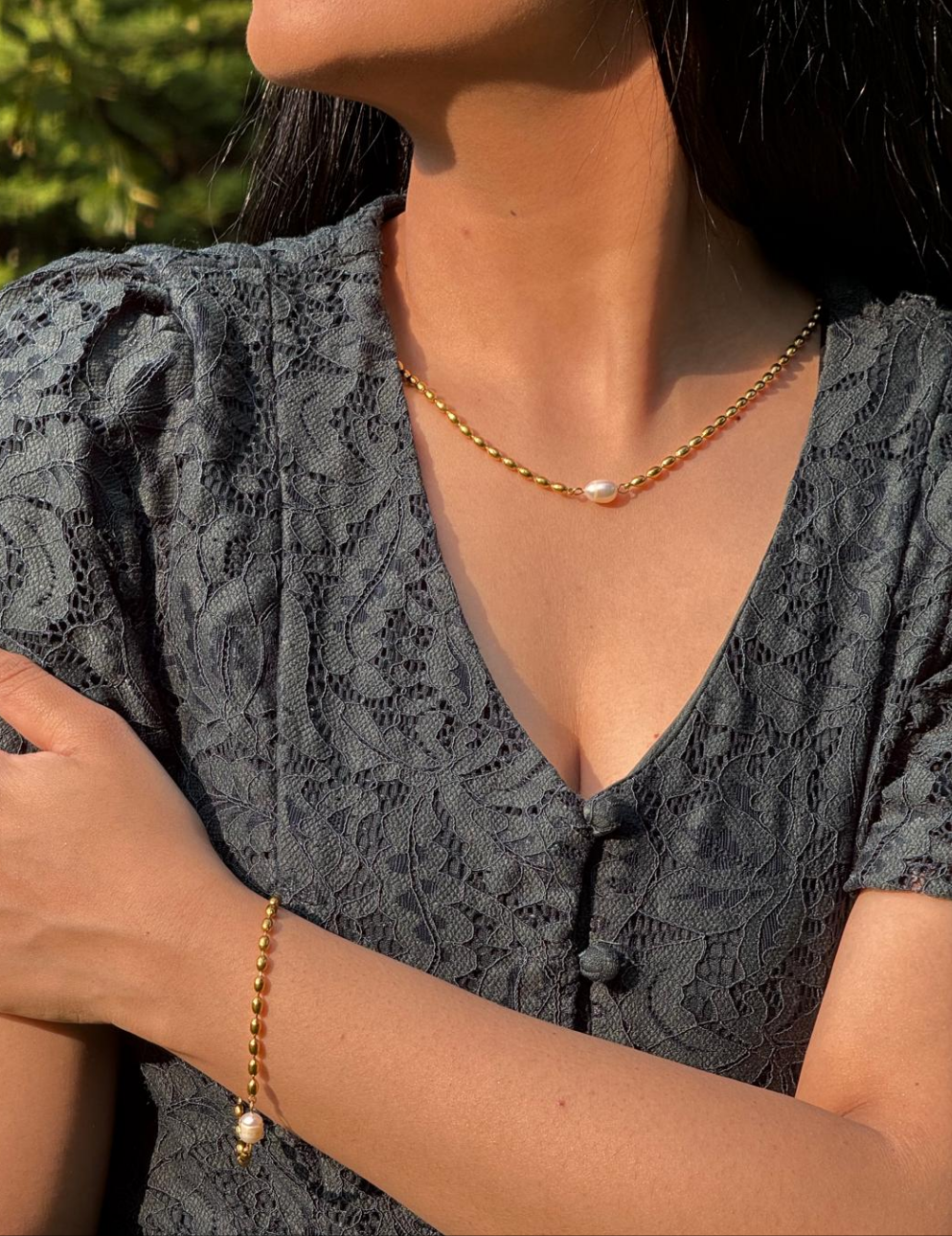 The Muse pairs a golden beaded chain with a single luminous pearl. A beautiful base layer or a timeless solo piece, it blends minimalism and classic beauty in perfect measure.